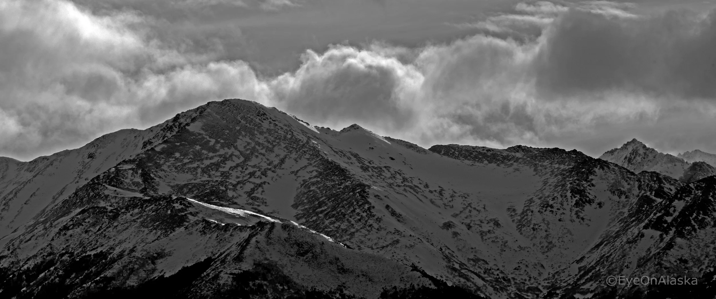 The view down Turnagain Arm towards the Kenai Mountains today. Nice dramatic light and clouds over the ridgeline.