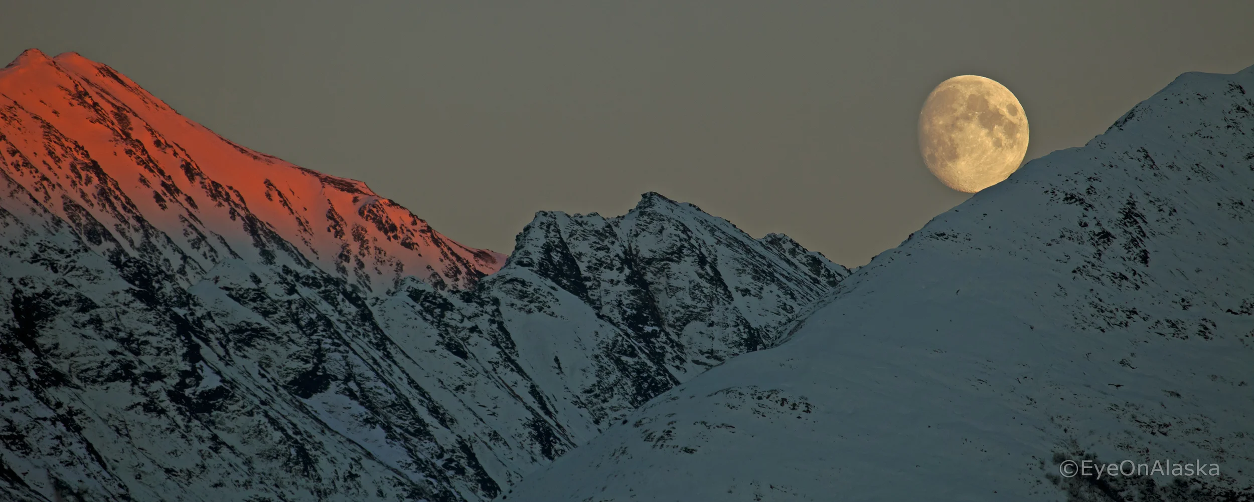 Shot this one a couple of years ago. Still one of my favorites. Driving back to Anchorage from Seward we were near Johnson Creek when we saw the moon just coming up. Had to pull a U-turn and get back to a safe place to park to get this one. The colors only lasted for about a minute after I got the camera out.