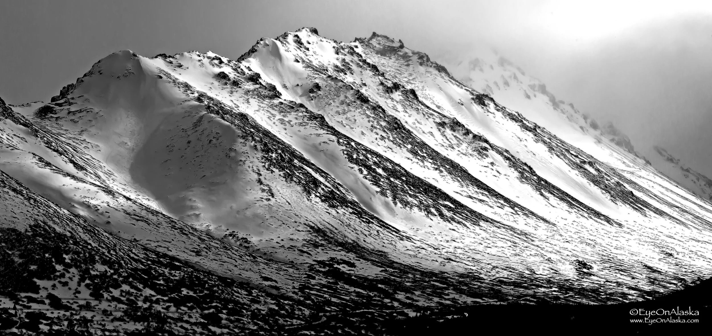 Dramatic light, cloud and shadow playing across the Chugach Range behind our house today. The look of the mountains changes by the minute, so the show never gets boring.
