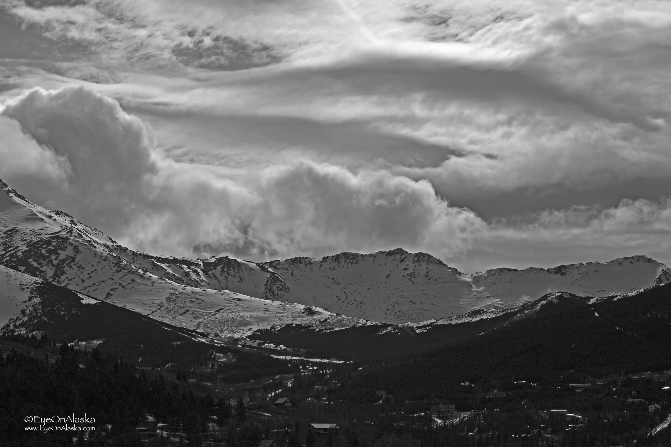 We've had a nice long run of brilliant days with bright blue skies and boiling clouds over the ridges above our home in Bear Valley. Yep, this is where we live.