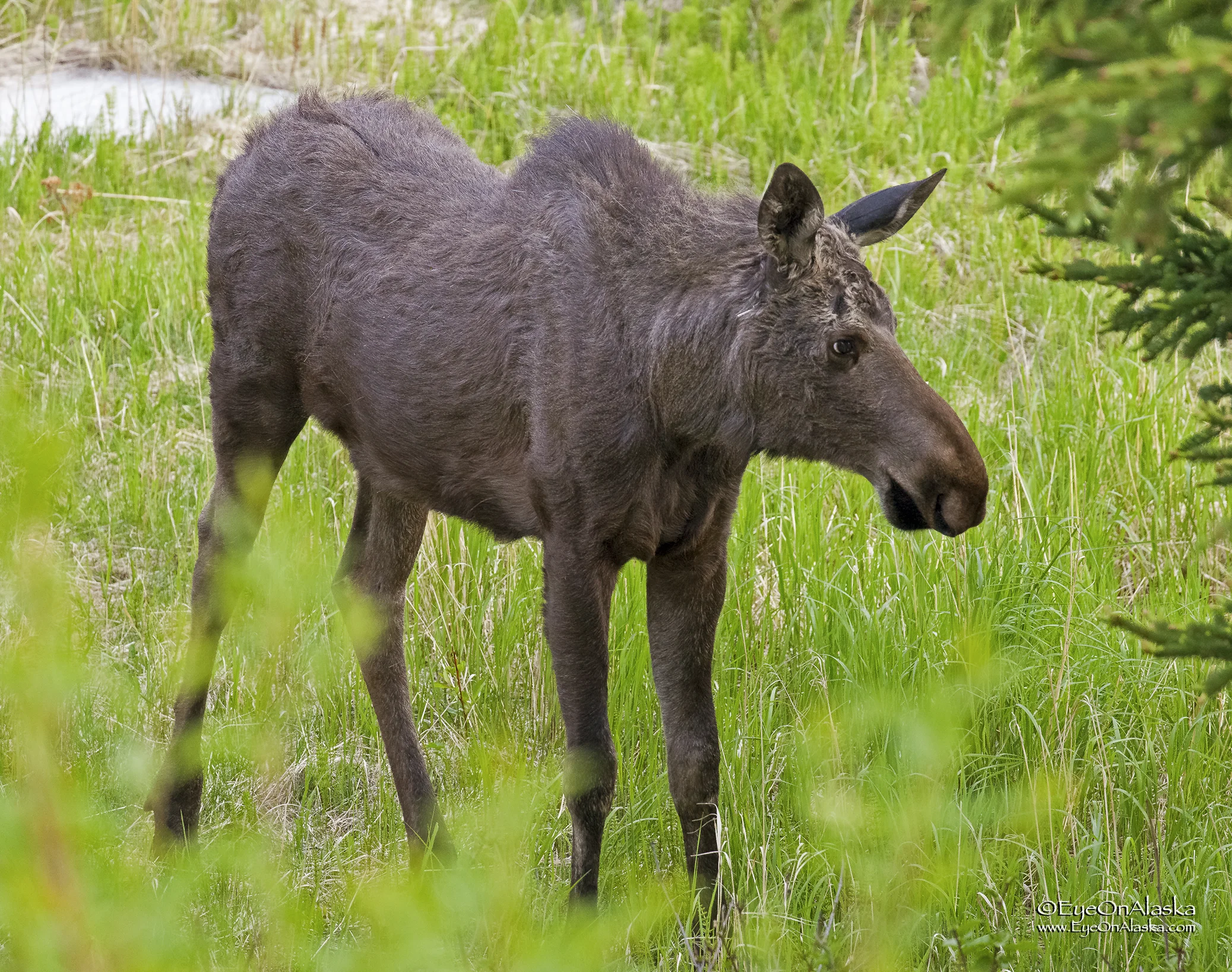 Morning visitor. May 24, 2016 by Chuck Berray Young cow moose hanging out just below the house this morning. View fullsize click for full-screen.