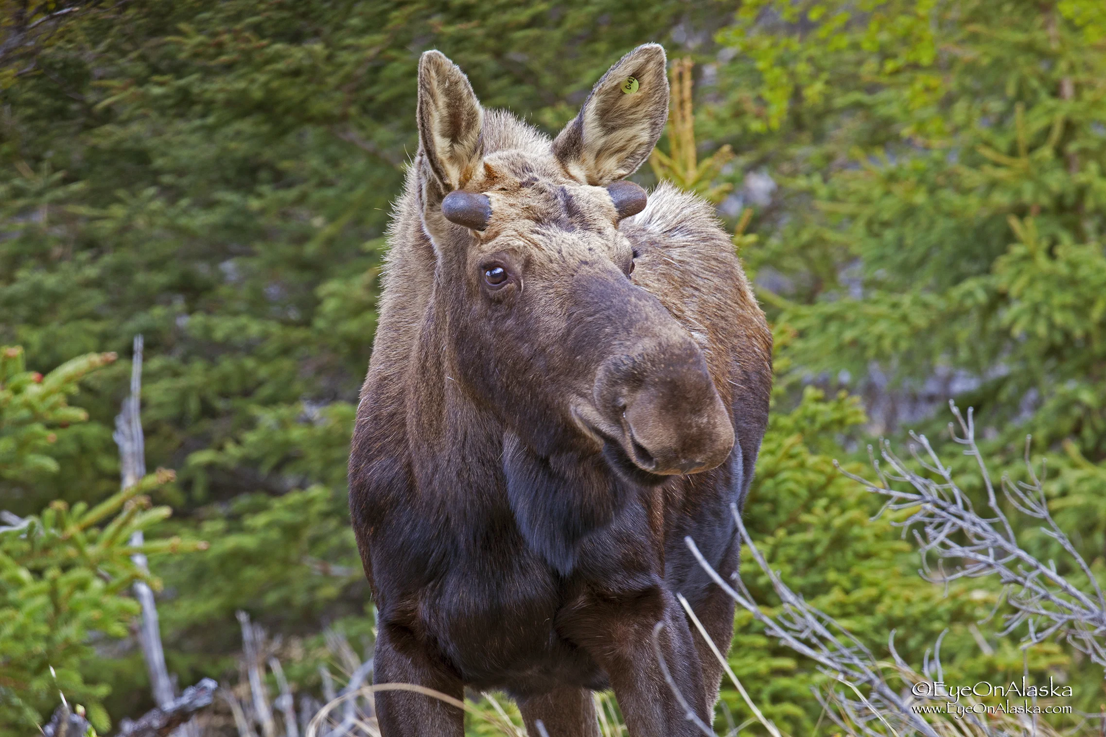 Young bull moose that's been hanging out all morning, looking very forlorn. Mom must have kicked him out this spring so she can have some new babies.