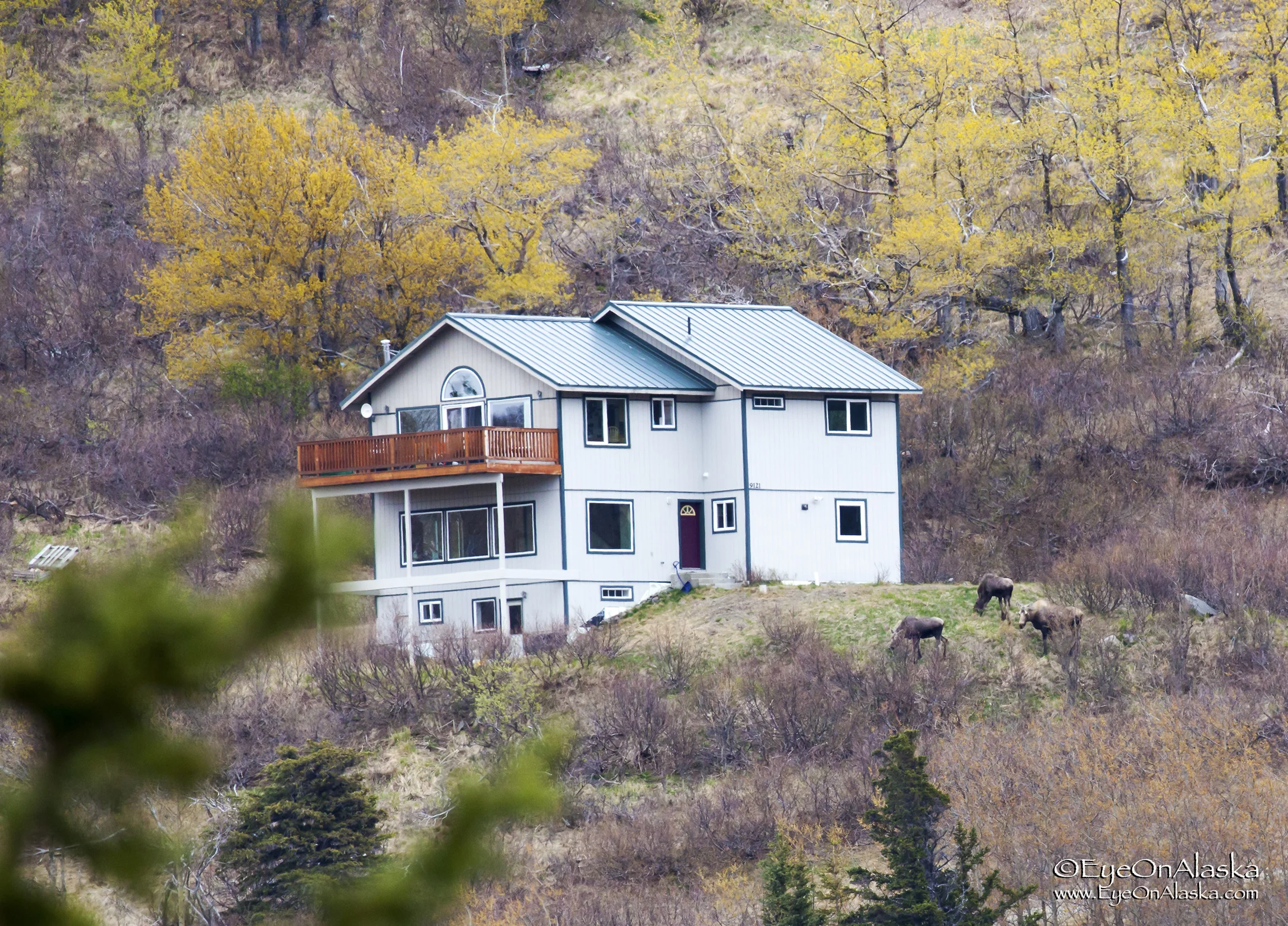Momma moose with last year's twins doing some lawn work at the neighbors. They're loving that fresh green grass.