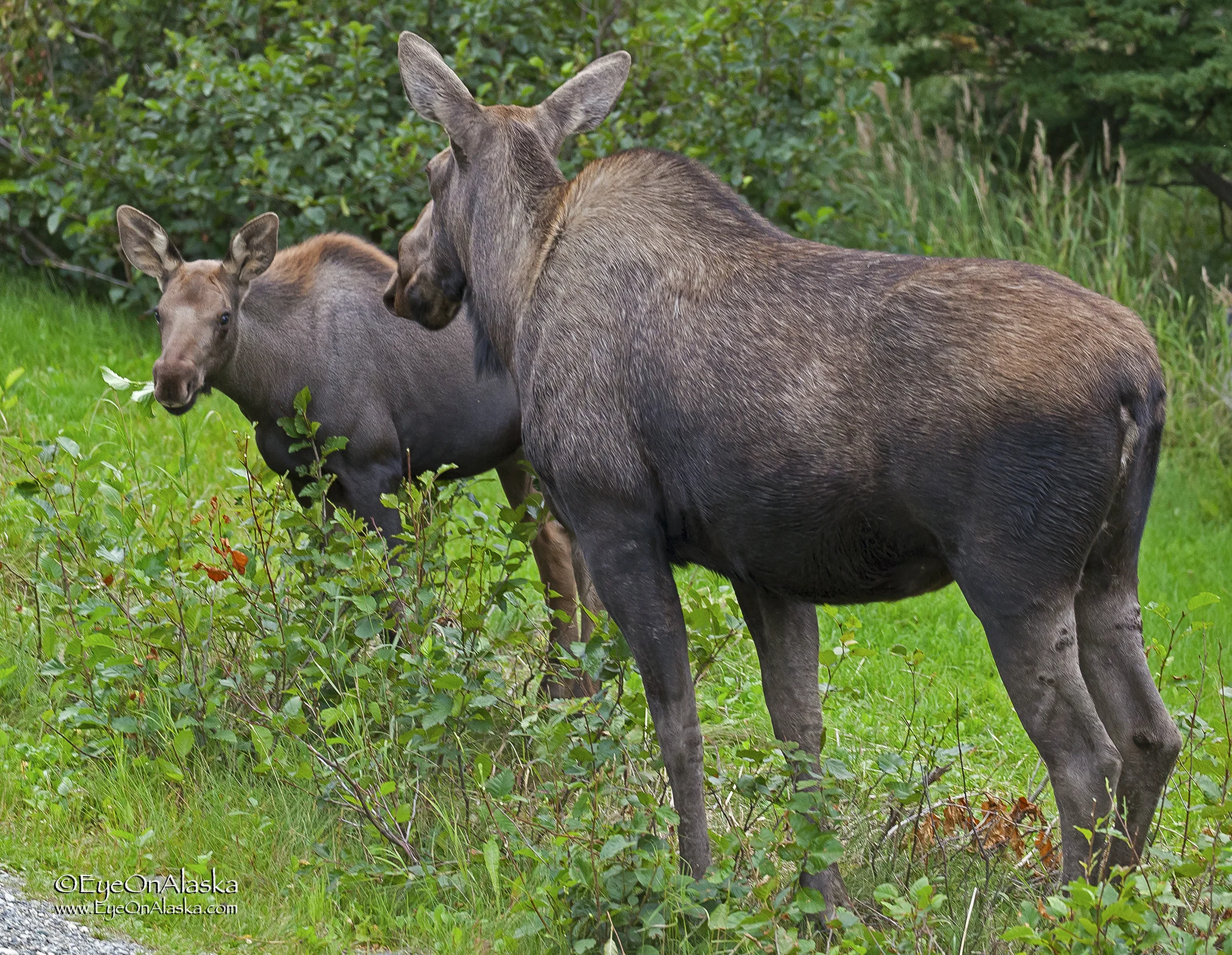 Mama Moose and baby were back in the front yard last night having a late snack. We see this pair all the time, but I'm worried about Mama--she was limping and didn't want to put any weight on her back leg. Hopefully not a very serious injury so she can get strong for the coming winter.