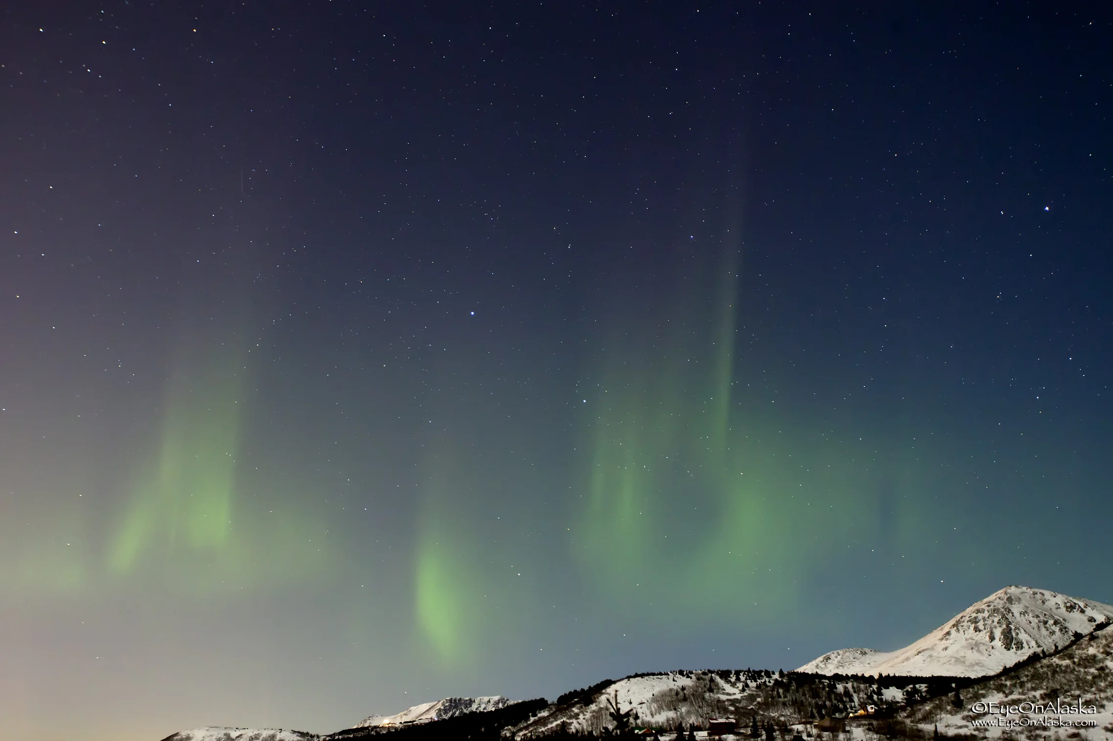 We've had an amazing run of aurora--eight nights in a row, which is the longest stretch I can remember in years when we've also had clear skies for that long. Last night the forecasts looked like that run was going to be over, so I didn't prepare for another night of shooting. Of course, when I woke up at 1 am and looked out the window, there she was! Not very intense at all, but just enough time to get dressed and outside to grab a couple of shots before it ended.